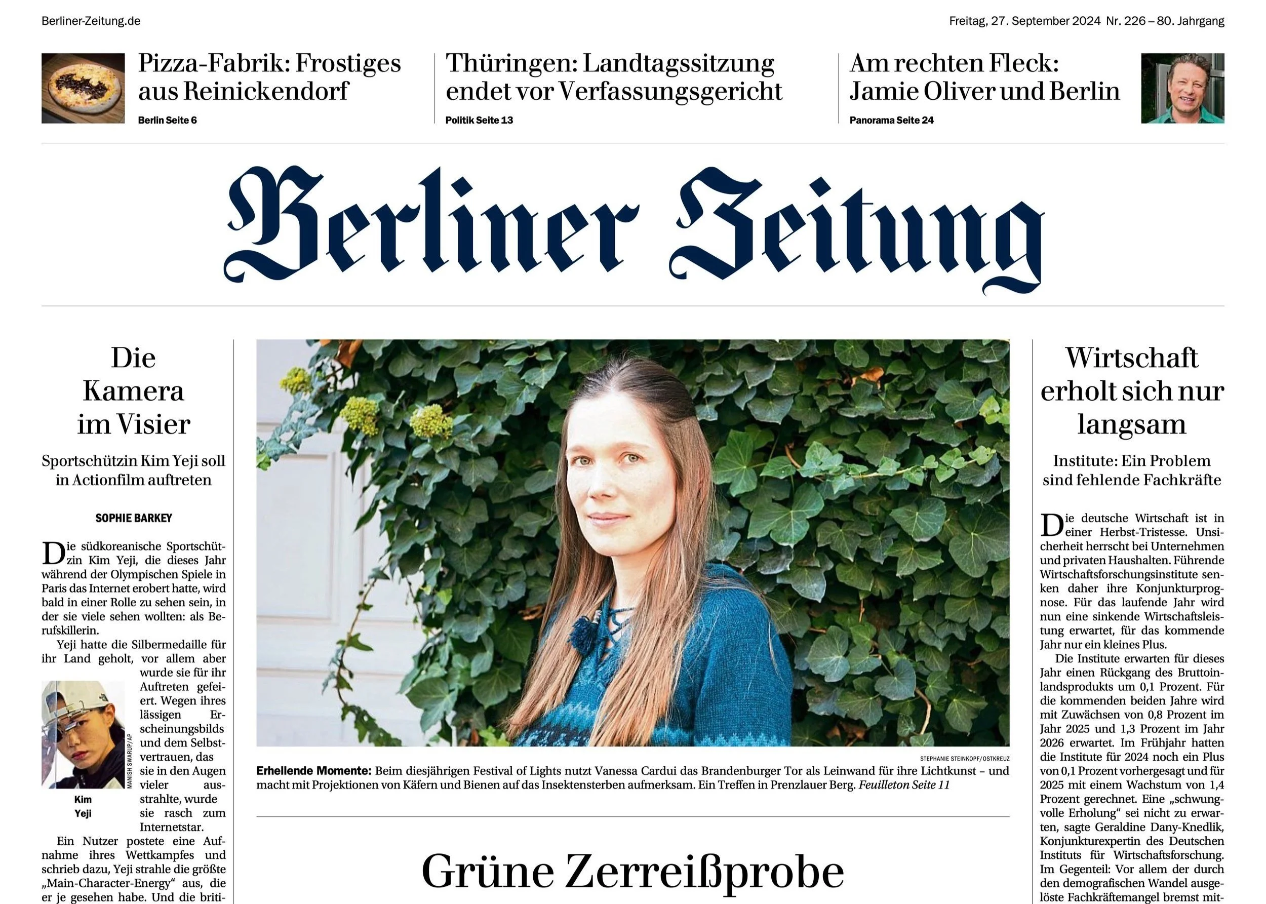 Franz Becchi, “Licht und Kür - Die Künstlerin Vanessa Cardui strahlt beim Festival of Lights Berlin das Brandenburger Tor an”, Berliner Zeitung, 27.09.2024, Titelseite und Seite 11