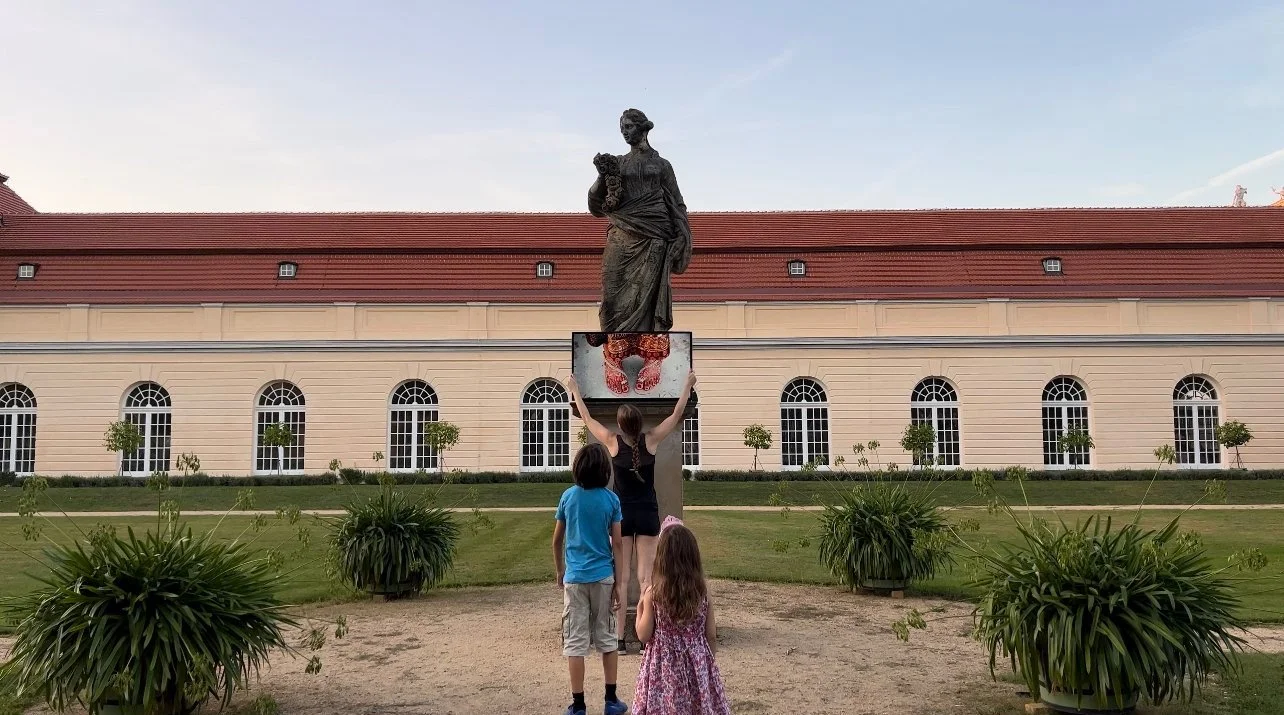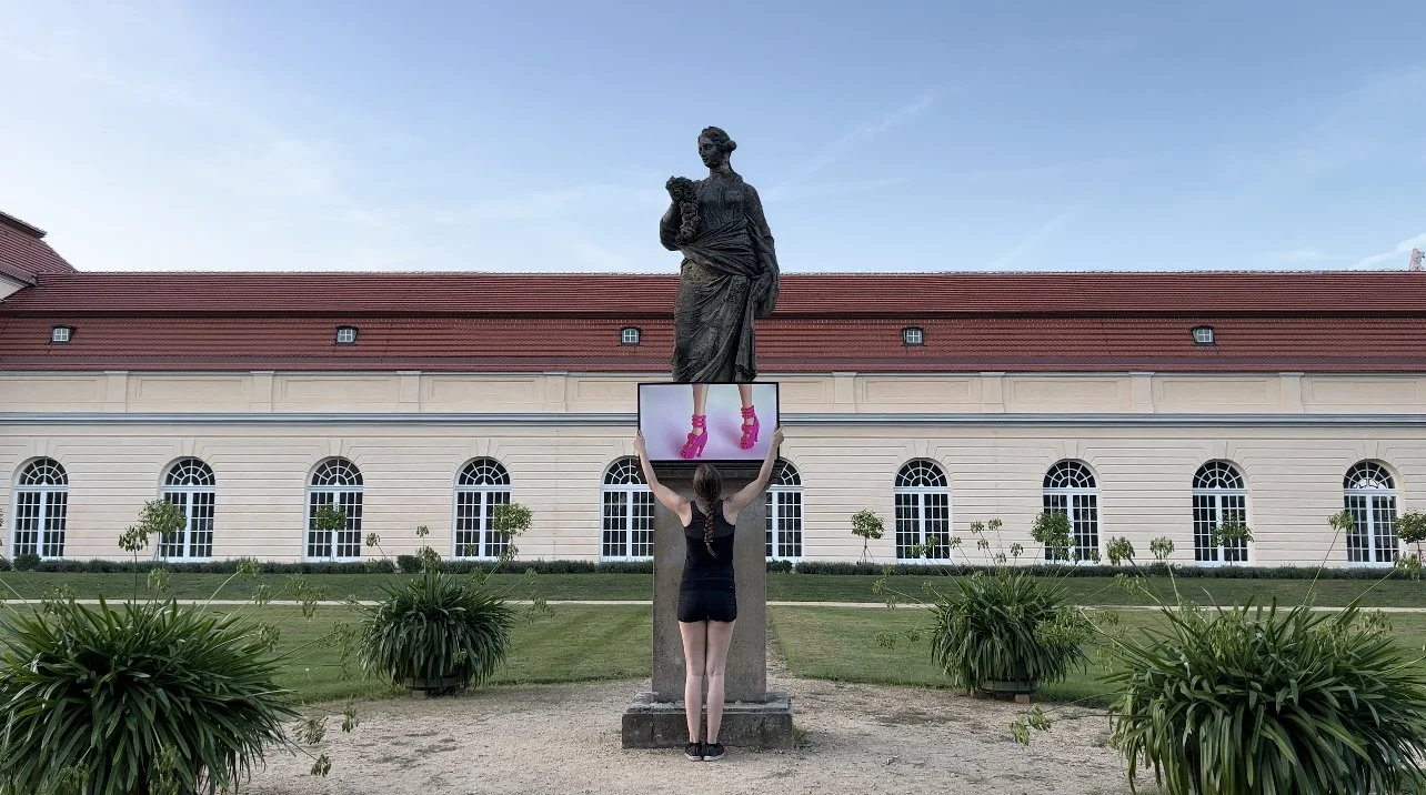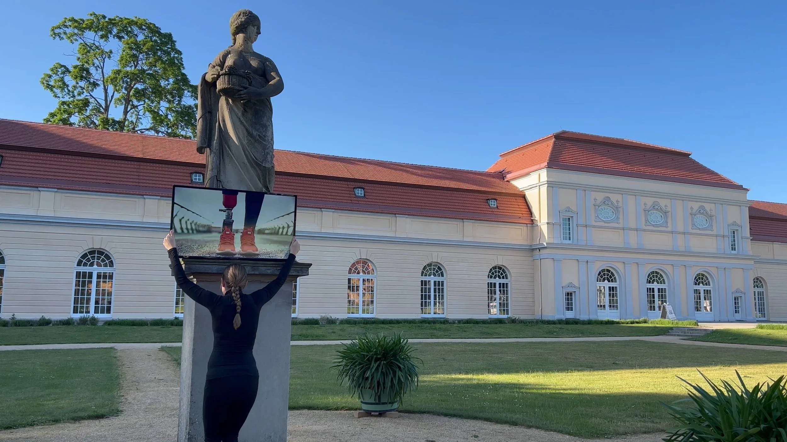 synopsis: KörperBau is a 30-minutes video walk through the baroque garden of Berlin Charlottenburg. The videos are site-specific - They refer to the body and the urban environment - overwrite landscapes, paint over sculptures and building facades and sketch the history. The videos enter into dialogue with the park of Berlin Charlottenburg Palace and provide new visual impulses. For example, the feet of the baroque Flora statue are transformed and evoke a modern image of women. The dome of the palace turns into a blossoming flower. The face on the royal vase awakens. And the fencer sculptures at the entrance gate fight with each other. Sculptures and facades are opened up and repositioned via the portable screen - Digital Art meets traditional sculpture. The aim of the intervention is to experiment with the medium of Video Art, to get it out of the interior and the classic cinema context and to bring it outside onto the street. It is a new playful and participatory approach to the medium of video art in urban space.