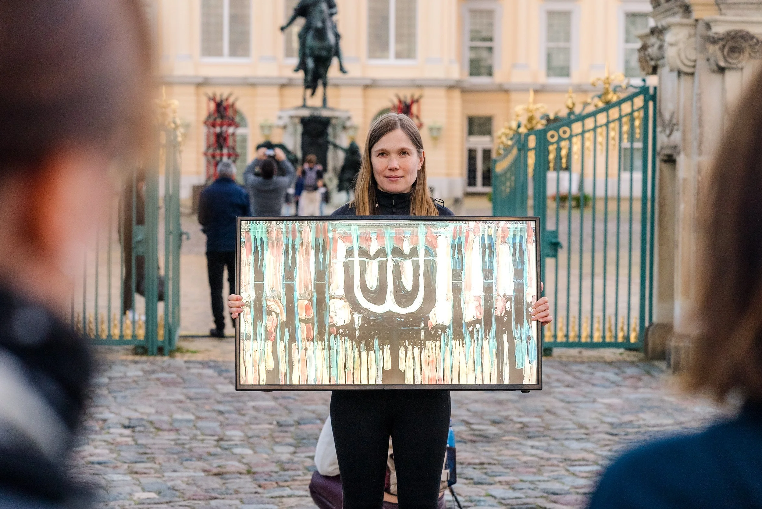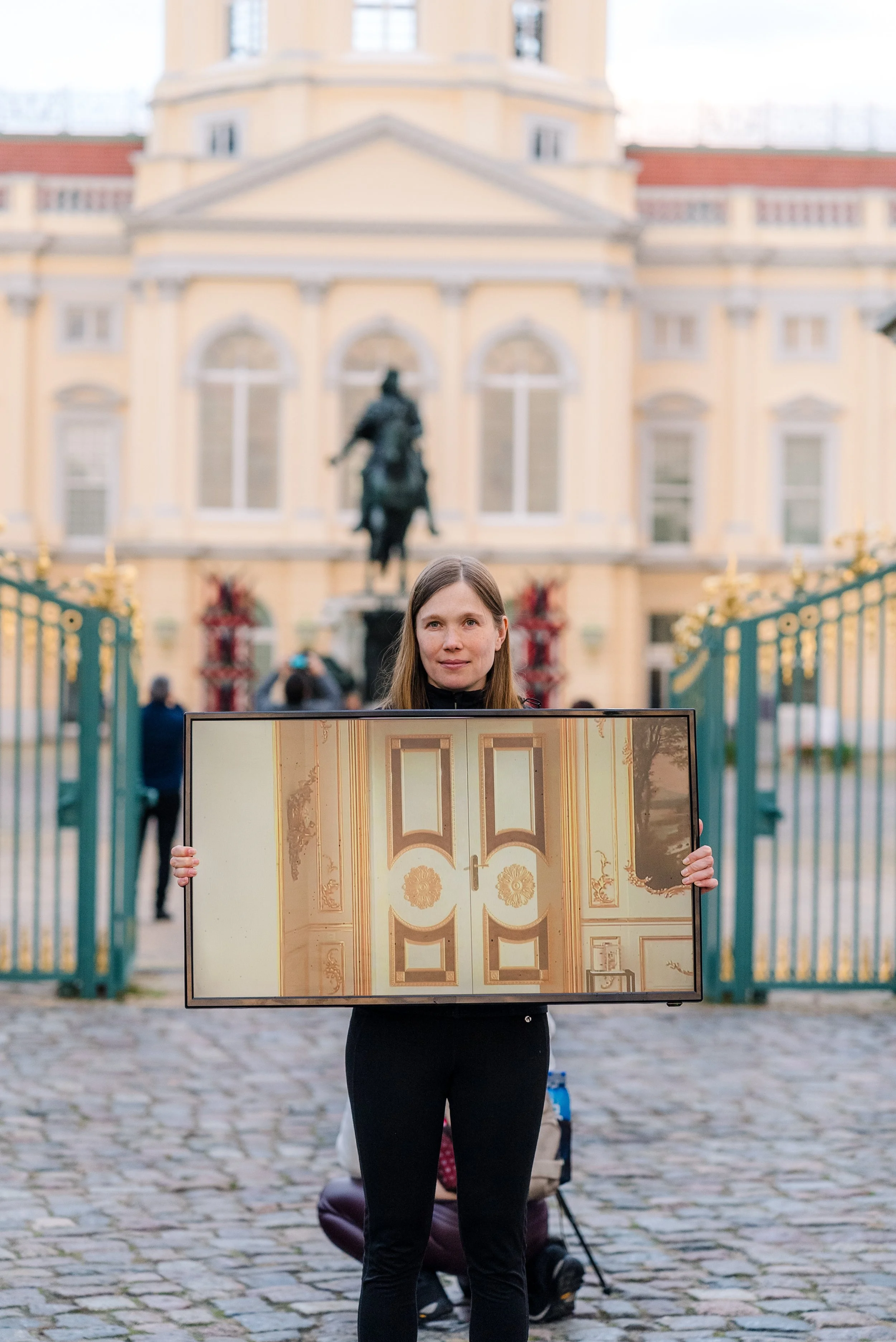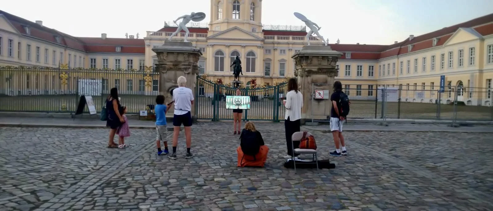 synopsis: KörperBau is a 30-minutes video walk through the baroque garden of Berlin Charlottenburg. The videos are site-specific - They refer to the body and the urban environment - overwrite landscapes, paint over sculptures and building facades and sketch the history. The videos enter into dialogue with the park of Berlin Charlottenburg Palace and provide new visual impulses. For example, the feet of the baroque Flora statue are transformed and evoke a modern image of women. The dome of the palace turns into a blossoming flower. The face on the royal vase awakens. And the fencer sculptures at the entrance gate fight with each other. Sculptures and facades are opened up and repositioned via the portable screen - Digital Art meets traditional sculpture. The aim of the intervention is to experiment with the medium of Video Art, to get it out of the interior and the classic cinema context and to bring it outside onto the street. It is a new playful and participatory approach to the medium of video art in urban space.