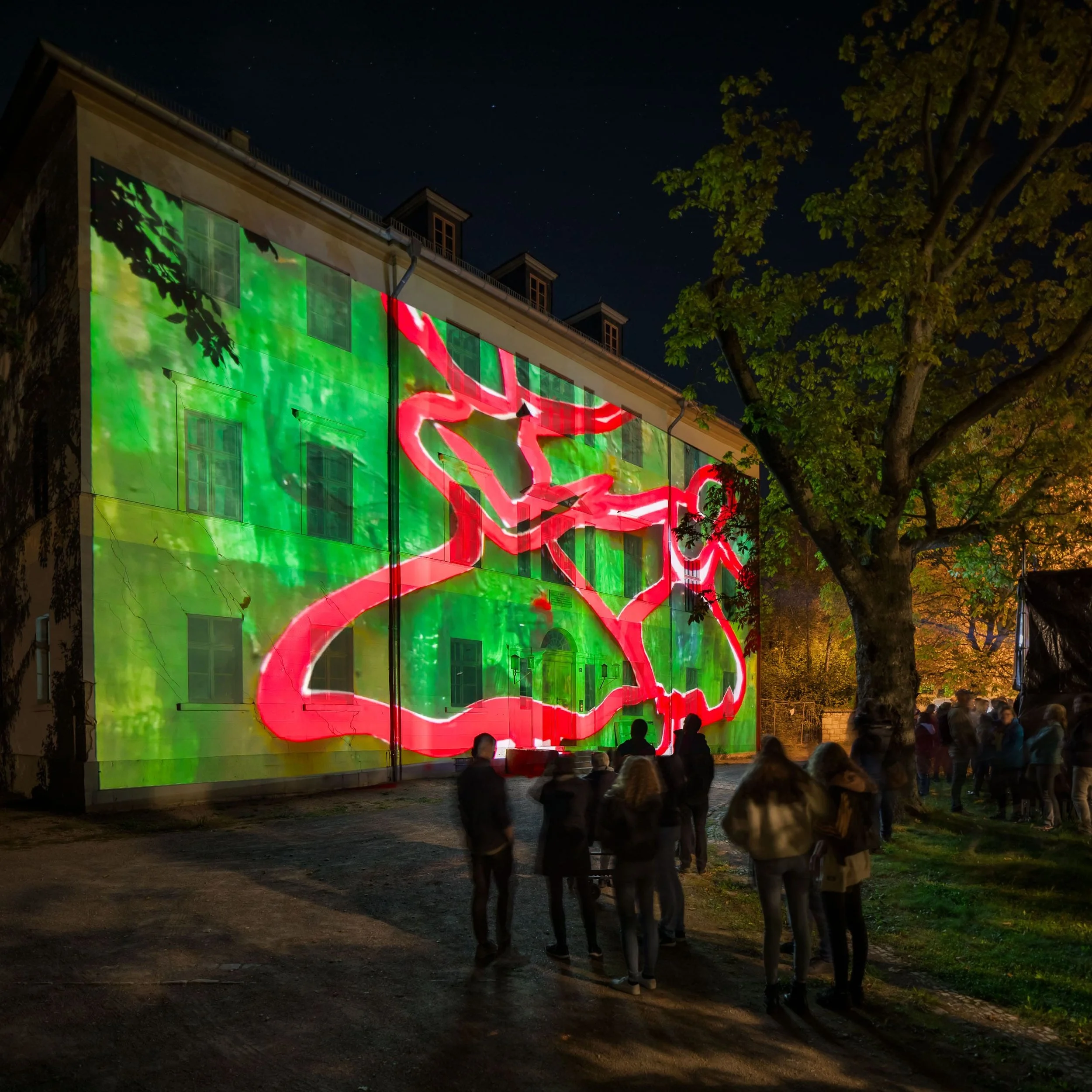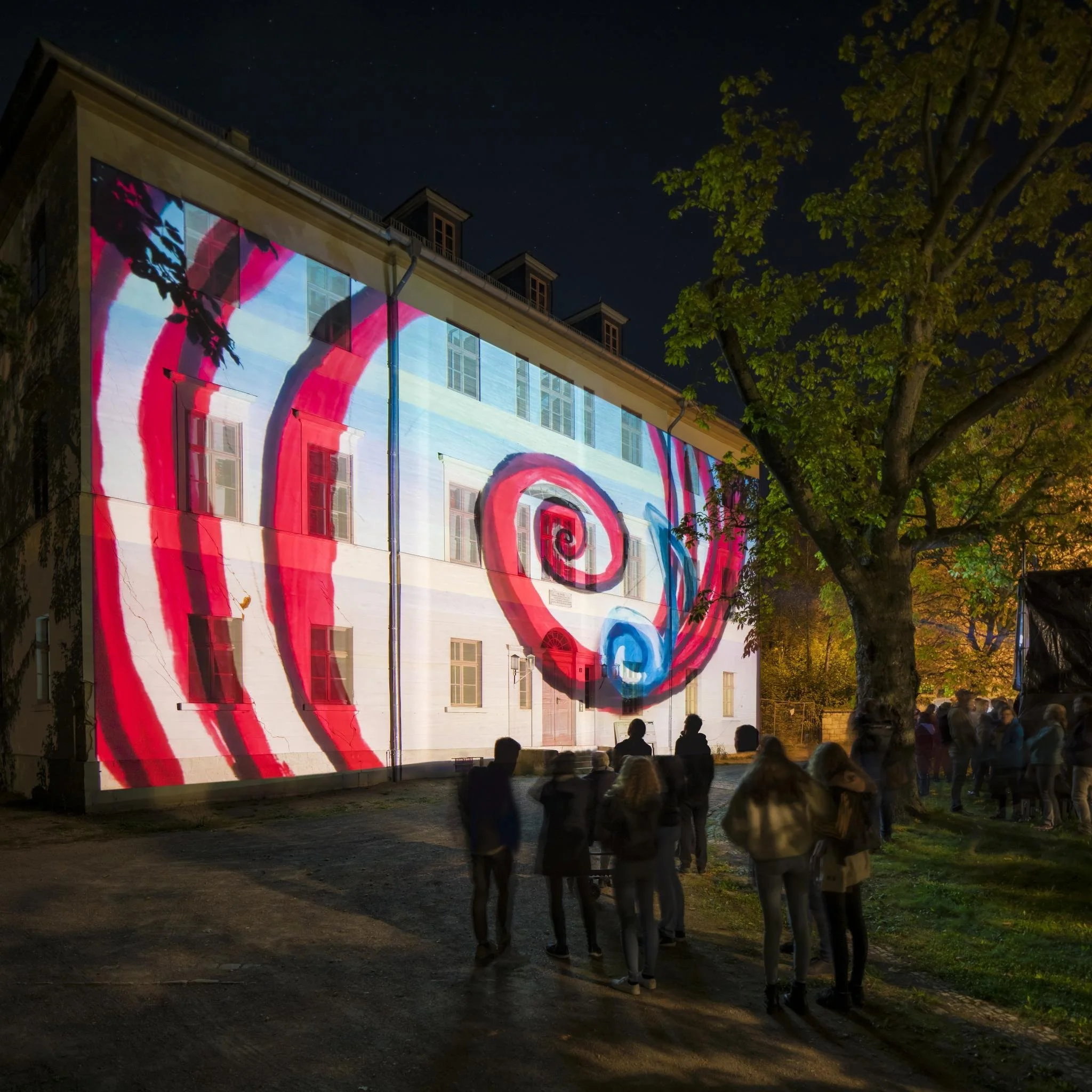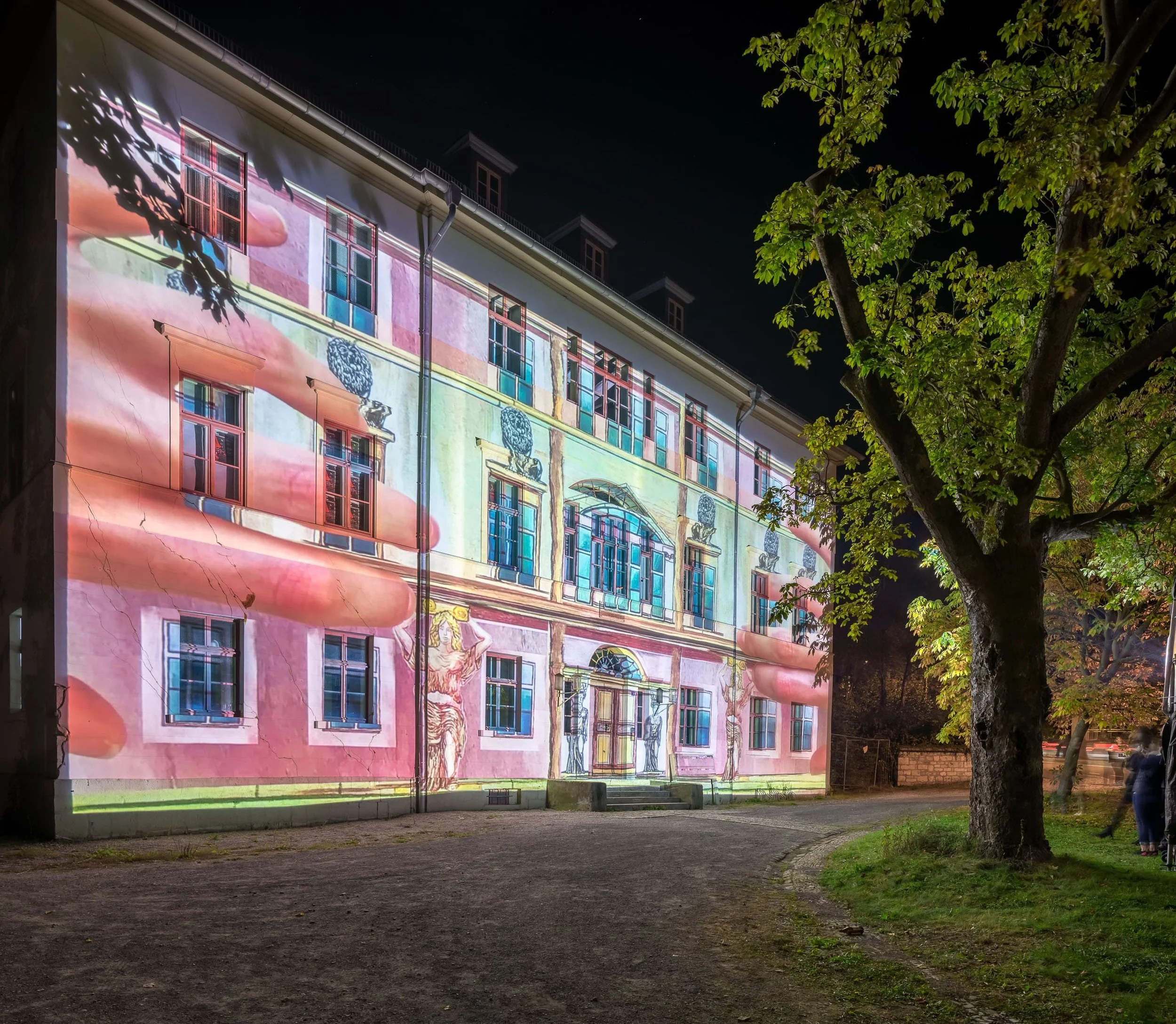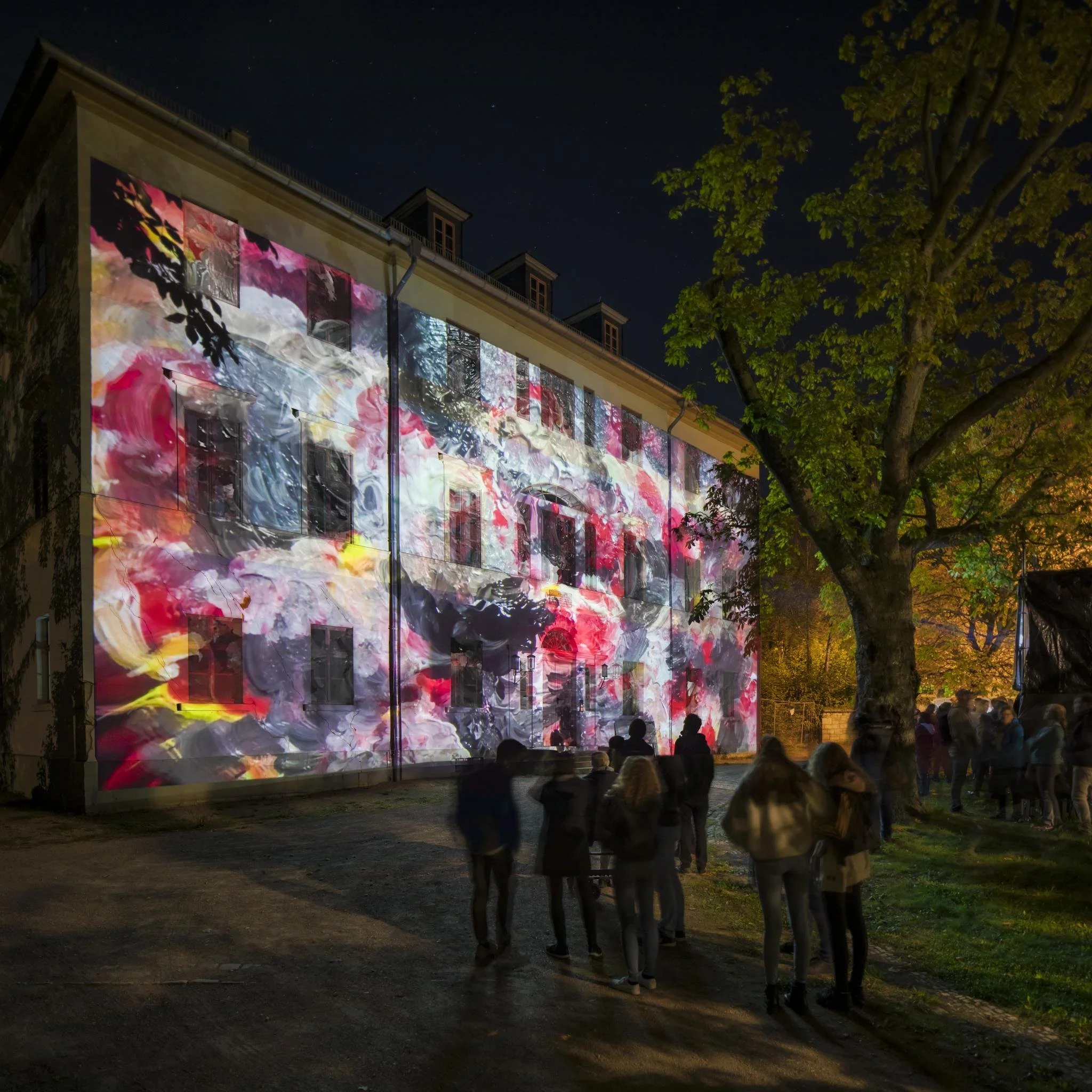 The graphic animations draw sketchy memories of that time on the facade of the Altenburg: on the one hand the bloody riots and street fights of the March Revolution, on the other hand the striving for freedom and unity, which moved to that uprising. The projection is accompanied by the composition "Am Grabe Richard Wagners" by Franz Liszt and “Walkürenritt” by Richard Wagner. It unites the coming into being and passing away, the blossoming, the poetic dimensions of music and the rebellion, which are figuratively written down on the facade.